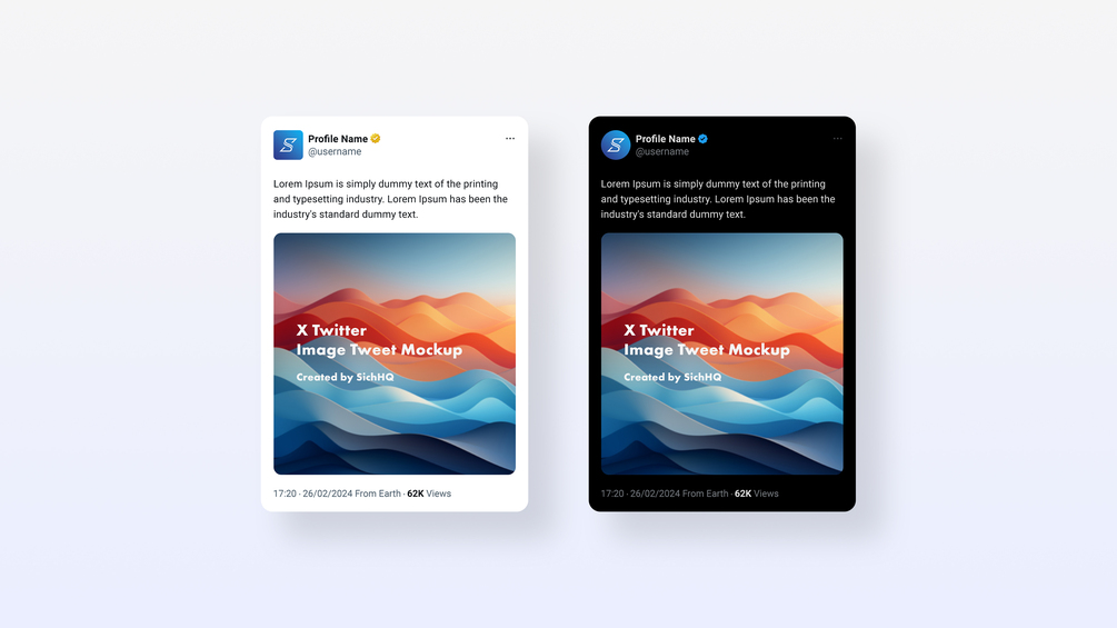 Here's a fully customisable X / Twitter square image tweet mockup PSD file in both light or dark mode variants, making it easy to visualise your profile concepts in seconds.